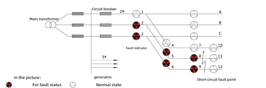 Căn cứ vào đặc điểm của sự cố ngắn mạch, tiêu chí hành động là sự thay đổi dòng điện đột ngột kèm theo sự cố mất điện của thiết bị bảo vệ. Logic diễn giải sơ đồ chỉ báo lỗi như sau: nếu các đèn báo 2, 5, 8 của pha A và các đèn báo 3, 6, 9 của pha C của đường dây 2 đều chuyển sang màu đỏ, trong khi các đèn báo 11 và 12 vẫn trắng thì có thể xác định rằng đã xảy ra lỗi đoản mạch tại điểm đường dây đi ra đó.